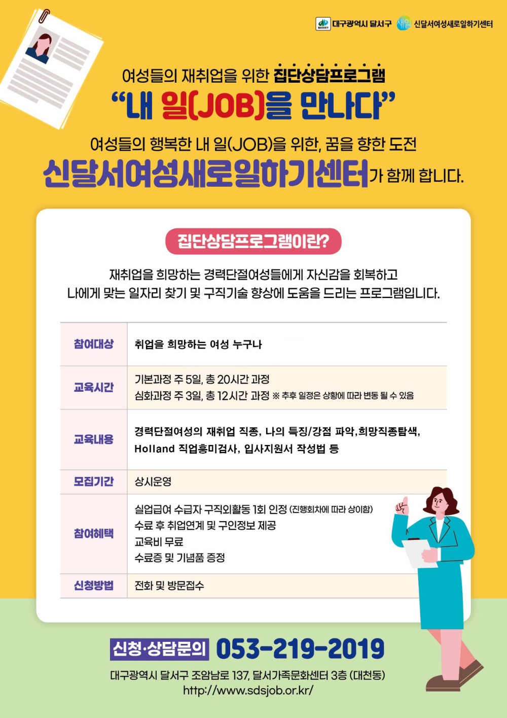 -모집인원: 20명 내외 (선착순 모집) -모집대상: 취업을 희망하는 여성 누구나 -교육기간: 2026. 3. 18.(수)~3. 20.(금) 09:30~13:30 (하루 4시간, 3일, 총 12시간) -교육내용: 취업직종 알아보기 / 홀랜드 직업흥미검사 / 입사지원서 작성법 등 -참여혜택: 교육비무료, 수료후 취업연계 및 구인정보 제공, 실업급여 수급자 구직 외 활동 1회 인정, 수료증 및 기념품 증정 -신청방법: 전화문의 및 방문접수 -문의: 신달서여성새로일하기센터(달서구 조암남로137 3층, 월배이마트 부근) 053-219-2019 |